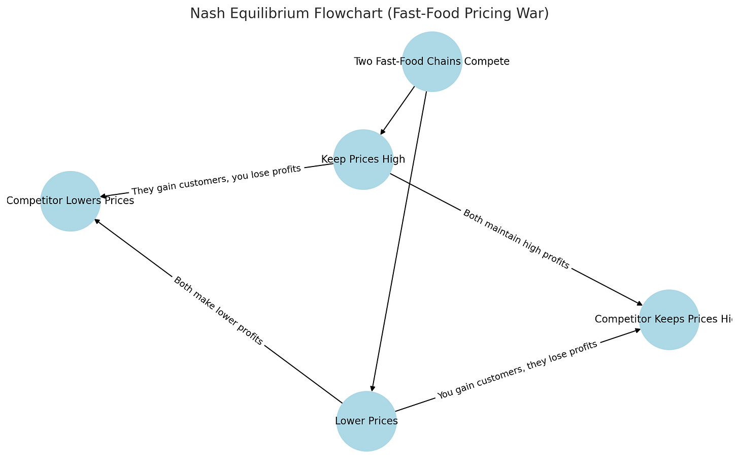 One Lowers, One Keeps Prices High: The one who lowers gains customers, while the other loses profits.